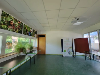 Kennzeichnend für unser Grünes Klassenzimmer ist der grüne Linoleumfußboden, der dem Raum einen ganz besonderen Charme verleiht. Nicht umsonst finden hier die Veranstaltungen der "Lernwerkstatt Ökologische Bildung“ statt. Der Raum ist mit einem Beamer und Pinnwänden ausgestattet. Hier finden ca. 10 bis 20 Personen Platz.