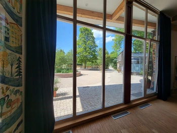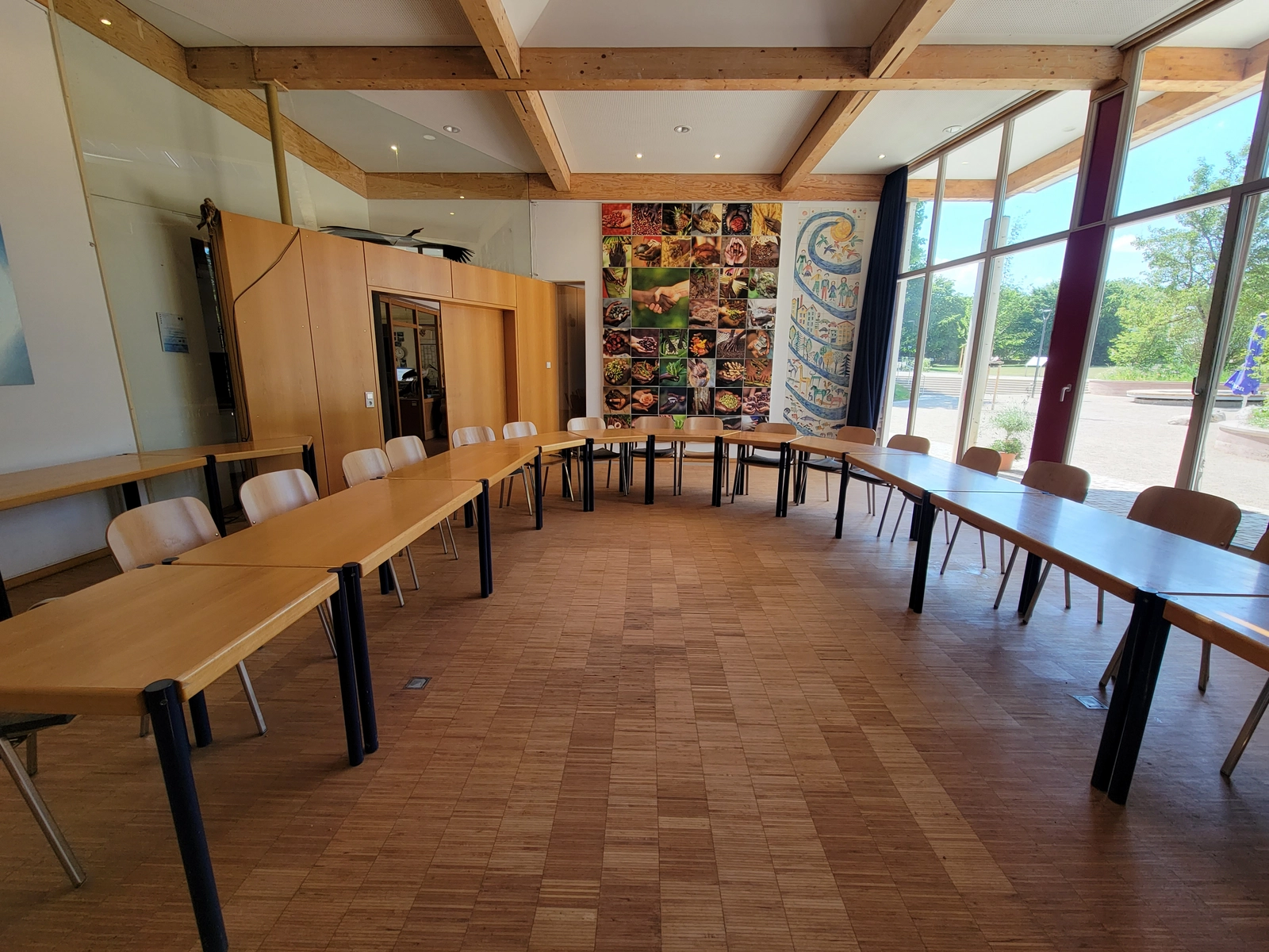 Das Herzstück unseres Hauptgebäudes ist 68 Quadratmeter groß. In dem lichtdurchfluteten Raum, dessen bodentiefe Fensterfront den Blick auf unseren Außenbereich freigibt, ist die gesamte Tagungstechnik wie Pinnwände, Moderationskarten, ein Beamer und eine Musikanlage vorhanden. Daneben besteht Zugang zum öffentlichen W-LAN der Stadt Fulda. Auf Wunsch kann weitere Technik, z.B. ein Laptop, bei uns ausgeliehen werden. Dieser Raum eignet sich auch hervorragend für Kinoabende und bietet ca. 20 bis 30 Personen Platz.