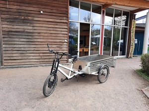 Unser Lastenrad der Firma Radkutsche vom Typ "Musketier" kann ein Gesamtgewicht von 300 kg transportieren. Wir nutzen es z.B. für den Transport von Leergut, von Heu und Stroh für unsere Hühner, für ein großes Insektenhotel oder Hochbeete, eine Ladung Kompost für den Garten oder einen Kühlschrank für die Lebensmittelretter.